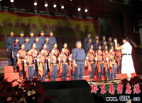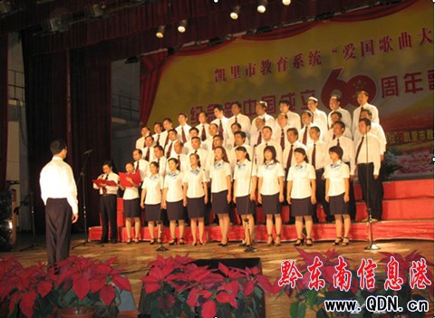 本港訊 (李蘭宇 記者 劉仙)在舉國歡慶祖國60華誕之際,9月28日至29日,凱里市歌舞團俱樂部喜慶盈天、歌舞如潮,由凱里市教育局、教育工會共同舉辦的“愛國歌曲大家唱”紀念新中國成立六十周年歌詠比賽在這里隆重舉行。