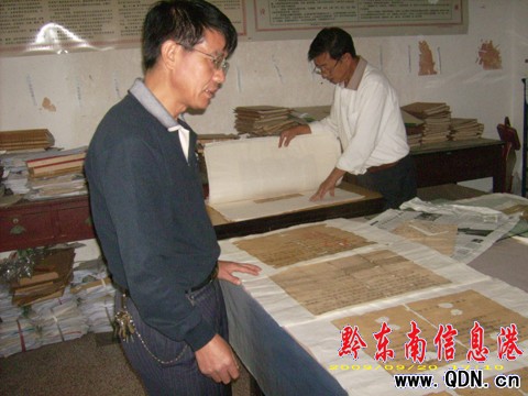 圖為黎平縣檔案局局長粟才昇正在整理明清社會文書的情形