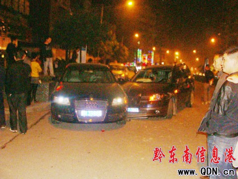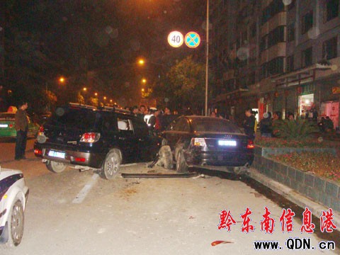事發后記者聞訊后于23日凌晨0時23分趕到了現場。這時,幾名民警將醉漢請上了警車,然后駛離了現場往醫院而去。記者看到,醉漢駕駛的三菱車還停放在路面上,車頭朝著凱里萬博方向,右前輪已經脫落,在地面上“躺”著。此外,車輛左前門也受到了重創,平整的門塊由此變得坑坑洼洼。