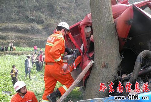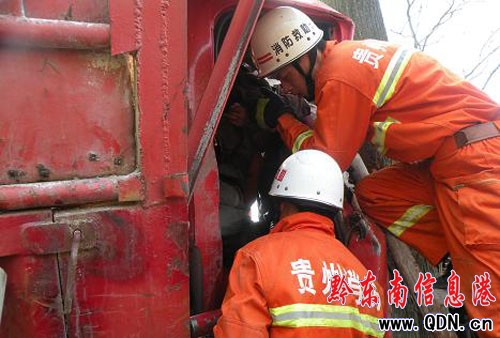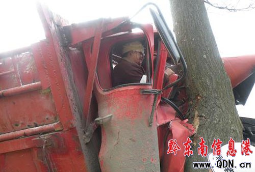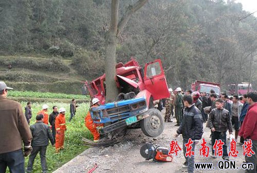 13時30分,救援人員到達事故現(xiàn)場,此時路邊已圍滿群眾,車輛堵塞成長龍。一輛貨車迎面撞在一棵樹上,車頭嚴重變形,坐在副駕駛室的一名人員被死死卡在里面。