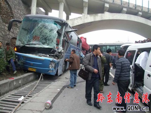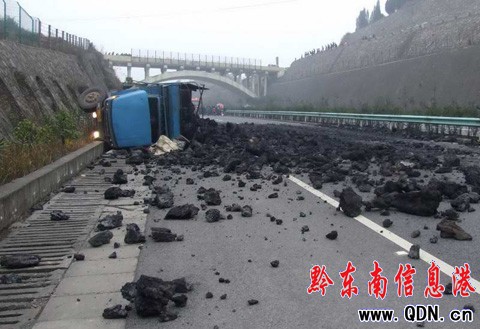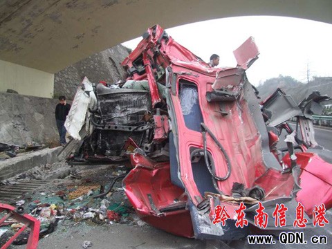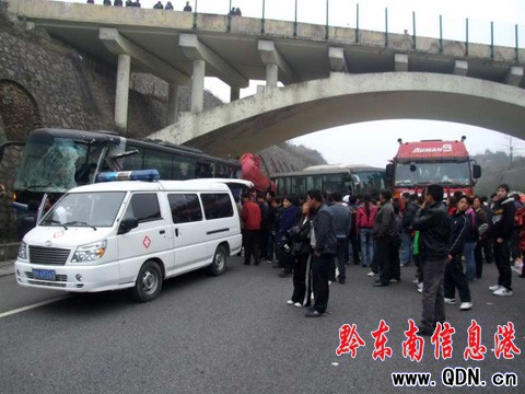 本港訊 (劉澤漢 攝影報道)2010年2月27日,三穗縣境內的滬昆高速公路發(fā)生一起5車連環(huán)撞車事故。當日7時10分許,一輛運煤卡車在三穗縣境內的滬昆高速(下行線)1569公里加500米處側翻,后一輛客車緊急剎車,后面一輛掛車與兩輛中巴車躲避不及連續(xù)發(fā)生追尾并撞上停在路邊的另一輛大客車。事故發(fā)生后,高速路政、武警消防、高速交警、醫(yī)務人員迅速趕到現(xiàn)場施救。事故造成掛車駕駛室內1人死亡、1人重傷、 1人輕傷,另外一輛客車2人輕傷。