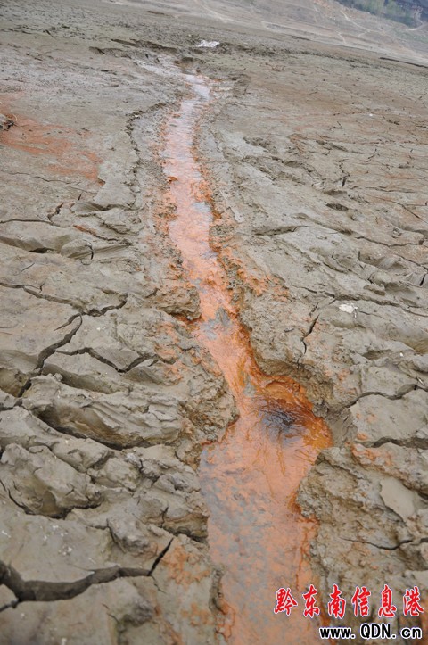 3月21日,記者在凱里城區三大水源之一的里禾水庫看見(里禾水庫向金泉湖供水,金泉湖是凱里城區的供水源頭之一),原來幾十米深的水庫僅有較深的下游庫區有水,蓄水量不及原來的一成,水庫下邊的水渠已經停止向金泉湖供水。水庫上游已經變成旱地,地面已經開了裂,有的裂縫深達十余公分。