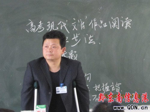 本港訊 (楊正洪 宋錫英)在美麗的黃平民族中學(xué)校園里,一位中等身材,剛40出頭的中年教師拄著雙拐在人來(lái)熙往的師生中艱難挪動(dòng)著,緩慢向教室走去。這位拄著雙拐的教師名叫賴?yán)飶?qiáng),是黃平民族中學(xué)高級(jí)語(yǔ)文教師。他勤勤懇懇、愛(ài)崗敬業(yè),先后30多次獲國(guó)家、省、州、縣教學(xué)能手、優(yōu)秀教師、優(yōu)秀共產(chǎn)黨員等榮譽(yù)稱號(hào),他愛(ài)生如子,傾情奉獻(xiàn)先后資助過(guò)200多名貧困生。他數(shù)十次強(qiáng)忍傷痛,拄著雙拐?qǐng)?jiān)持上課,以堅(jiān)強(qiáng)的毅力和強(qiáng)烈的責(zé)任意識(shí),詮釋了他完美無(wú)瑕的教學(xué)人生。