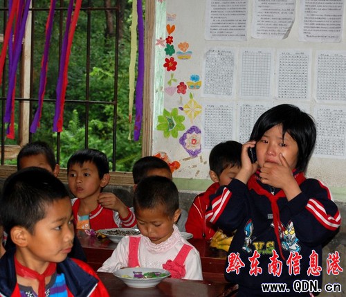 隨后,50多名留守學(xué)生通過10臺免費“親情電話”跟遠在千里之外務(wù)工的父母談話,匯報學(xué)習(xí)和生活情況,寄托了他們的相思之情。“媽媽,媽媽,聽到我的聲音了嗎?……”,“爸爸、媽媽!今年能不能回家過年,我們好想你……”, “爸爸、媽媽,您們都好嗎?我們今天好開心呀!不要擔(dān)心我。我們雖然留守在家,但并不寂寞、孤單。這里有好多叔叔、阿姨和老師們專門來看望我們,關(guān)心我們,和我們一起做游戲過節(jié)……”