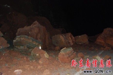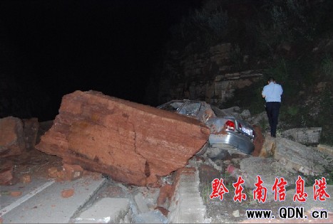 山體滑坡 小轎車被巨石撞出公路(圖)