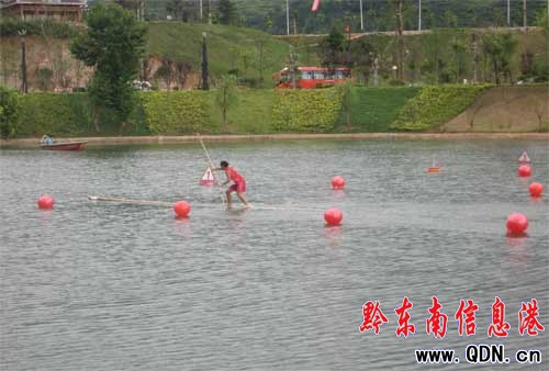 下午的獨竹漂比賽有來自麻江、凱里、凱里學(xué)院、錦屏、榕江和施秉等六個代表隊參加了比賽。經(jīng)過激烈的淘汰賽,最終進(jìn)入決賽的分別是凱里學(xué)院代表隊、麻江代表隊、榕江代表隊、凱里代表隊四支隊伍。