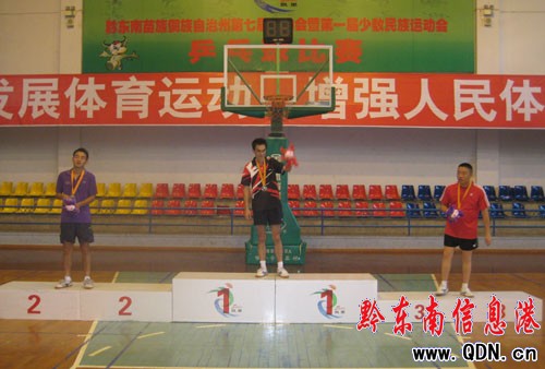 男單決賽最后冠軍由凱里隊的周海強獲得,亞軍由軍分區(qū)代表隊的王宇獲得,麻將隊的李勇獲得第三名。