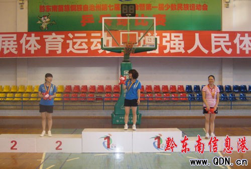 相比緊張激烈的男單決賽,女單決賽則“和諧”不少,因為交戰(zhàn)雙方都是來自劍河隊的隊員,最后,劍河隊的潘璇以11:6,11:6,11:5連下三局戰(zhàn)勝了之間的隊友龍紅玉獲得冠軍,龍紅玉獲得亞軍,季軍由榕江隊的石燕獲得。