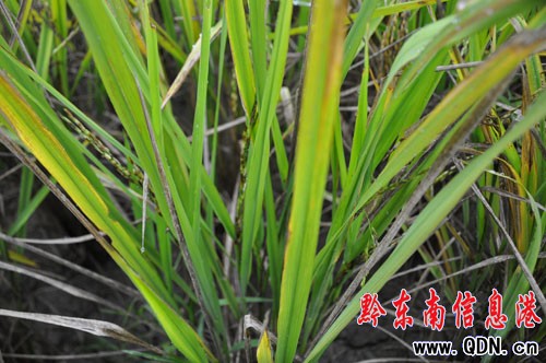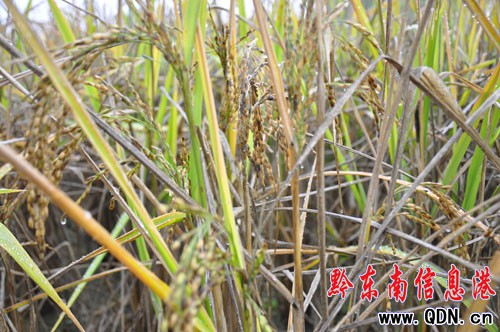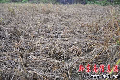 越過水渠后,果然出現楊老漢說的凄慘場面:一塊面積約二分的田,水稻倒成一片,葉子呈黑色,應為一片金黃色的稻谷,中間參雜著黑色的物質。水稻下面,深深的裂痕清晰可見。