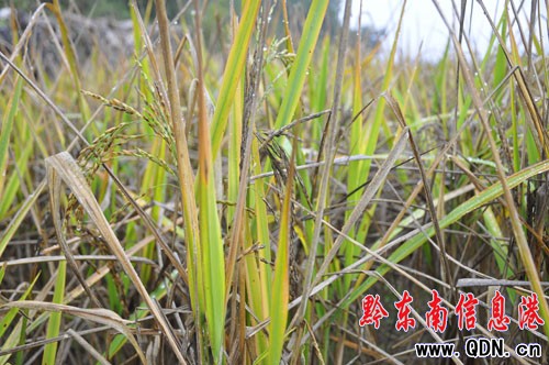 本港訊 (記者 楊驥 攝影報道)自7中旬以來,凱里地區艷陽高照,雨水極其稀少,該市地勢較高且水源稀少地區遭受較為嚴重的旱情。接到群眾反映,10月14日,記者來到鴨塘街道區的四聯村埡口采訪得知,該村水稻減產約一半之多,很多水田顆粒無收,村民介紹說,今年是該村近20年來收成最慘的一年。