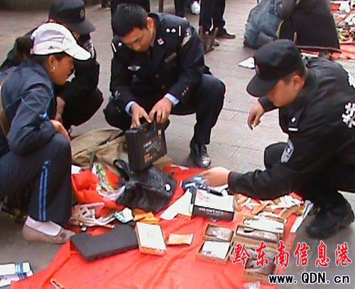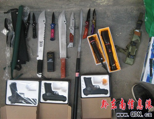 據警方通報,近期,四川省阿壩地區藏族人員在凱里市步行街以販賣西藏土特產草藥為由,大量販賣匕首、大砍刀等管制刀具,給凱里市社會治安帶來極大隱患。引起了凱里市公安局黨委高度重視,州公安局副局長、市公安局局長楊天權于11月9日責令治安大隊、西門派出所、特(巡)警大隊、治安聯防特勤大隊組成100余警力聯合在凱里市步行街實施清理整治行動。行動中共查獲販賣管制刀具、仿真(鋼珠)手槍、警用電棍等違法嫌疑人14人,收繳管制刀具90把、防真警棍30根、仿真 (鋼珠) 手槍24支、防真警用電棍25根。