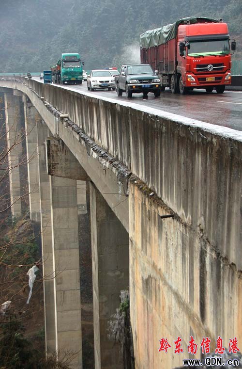 由于凱麻路2日處于封閉狀態(tài),3日上午,在路政與交警的處理下,冰凍橋面可以謹慎通行。于是滯留于該路段及從貴新路、玉凱路駛來的大量車輛不斷涌上凱麻,致使凱麻路上結冰較厚的涼沖大橋、羊跳大橋等多處橋頻繁出現(xiàn)擁堵。