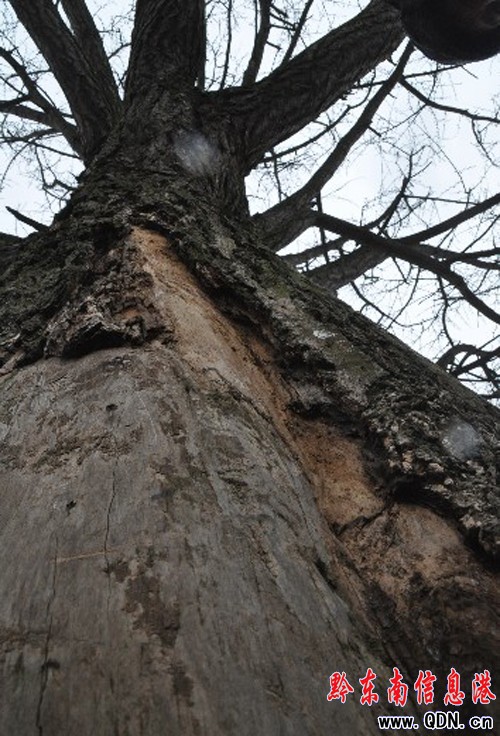 2005年,村民們出于對這株老銀杏的愛護,建圓形花壇將其根部圈了起來,最初沒有什么不良反應,大約在2008年,老樹就顯現出了病態,主要表現在大量葉子脫落,根基部樹皮逐漸腐壞。到去年,村民急壞了,向上級求援,但是由于救治這株老古樹需要數萬資金,所以它遲遲未得到救治。