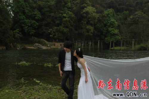 黎平八舟河上的紅色景點紅軍橋已成為湖南長沙、廣西南寧、貴州貴陽等城市結婚新人拍攝婚紗紀念照的好地方。截至4月10日,已有80對新人,來到這里拍攝婚紗照片。4月18日筆者在紅軍橋景點看到從貴陽乘飛機趕來拍攝婚紗照的周松和劉英,他們格外興奮,他們說,來這里拍結婚照的意義不一樣,這里有山、有水、還有紅軍橋,照片特有靈性。圖為他們正在拍照的情形。