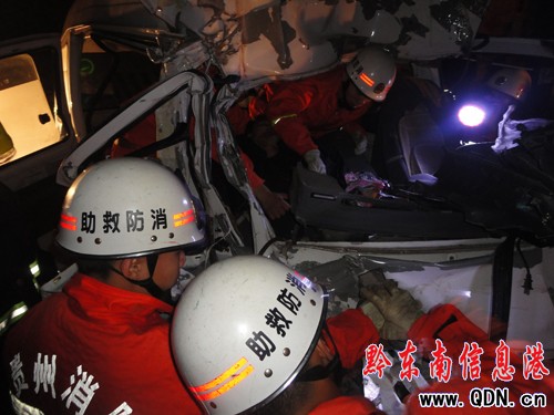 兩車相撞一人被困 施秉消防深夜急救援(圖)