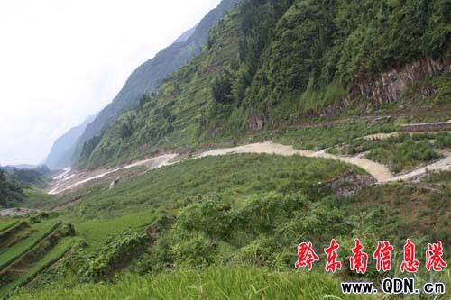 順著公路往西直上,到達(dá)了黔東南最大的水電站——三板溪水電站庫(kù)區(qū)八受移民新村,整齊別致苗家吊腳樓,樓板光亮的油漆在雨的浸洗下閃閃發(fā)光,遠(yuǎn)遠(yuǎn)看去就是八受河,這是入清水江一大支流,持續(xù)一個(gè)月的炎熱高溫干旱天氣使河流水位與以往同期相比下降30米左右,一條水降線的旱紋顯示出少雨的標(biāo)志,然而8月5日晚的大雨卻把半米高的河流旱紋水位線抹去。