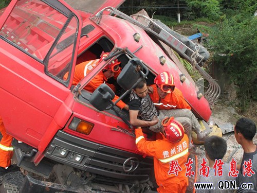 貨車爆胎釀險劇 麻江消防破拆成功救援(圖)