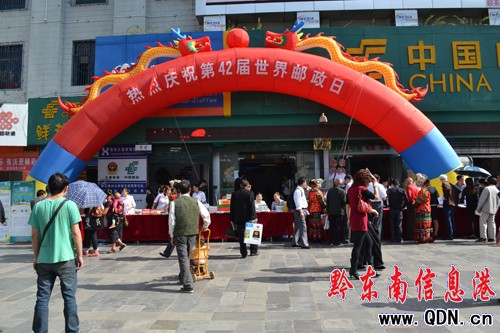 在凱里市大十字郵政營業廳門前,黔東南州郵政局設置了大型彩虹門、10余張宣傳臺席、6塊宣傳展板和10個展架,主要圍繞著黔東南郵政業務、郵政改革發展、郵政普遍服務、郵政服務“三農”、 服務中小企業、郵政進社區以及新《郵政法》實施等方面開展宣傳。據統計,當天共發放郵政業務宣傳資料17000多份、接受用戶咨詢近1000人次,在集郵品展臺前,“中國共產黨成立90周年”、“第九屆少數民族運動會”集郵品受到集郵愛好者的熱烈追捧。