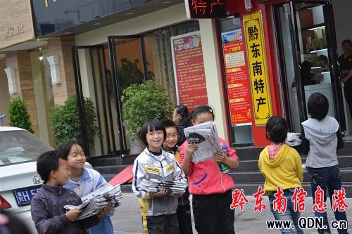 10月22日上午記者在凱里友莊路看到一群小學(xué)生在街頭賣(mài)報(bào),記者走近看到他們正在對(duì)人行道旁的各個(gè)門(mén)面進(jìn)行賣(mài)報(bào),這到底是為什么?看著這些小學(xué)生一個(gè)個(gè)著裝整齊,不像家境很窮的樣子,為什么會(huì)這樣?帶著這個(gè)疑問(wèn)記者隨后采訪到了這些小學(xué)生。
