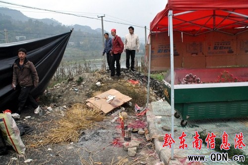 記者走近帳篷,死者的大兒子楊光富迎了上來,他說,其父出車禍后,遺體竟被隨意放置在垃圾堆旁邊,引起了包括他在內的親屬的不滿。記者看到,此處果然有垃圾堆存在,垃圾堆上還有塑料袋、煤球等物品。