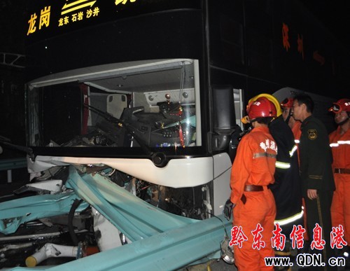 05時(shí)15分,消防官兵到達(dá)現(xiàn)場(chǎng),看到一輛長途大客車撞在隔離帶上,車頭已被隔離帶刺穿并嚴(yán)重變形,司機(jī)被卡在車頭內(nèi)動(dòng)彈不得,并痛苦的呻吟著,車上約有30名乘客因車門變形無法出來,現(xiàn)場(chǎng)情況十分緊急。消防指揮員立即下令分三組進(jìn)行救援:第一小組由兩名身形較小的消防戰(zhàn)士進(jìn)入車頭內(nèi)部對(duì)車頭內(nèi)部的汽車殘骸進(jìn)行清理,并對(duì)被困人員進(jìn)行保護(hù)防止二次受傷;第二小組對(duì)變形的車門進(jìn)行破拆,以便被困乘客能出來;第三小組用切割機(jī)對(duì)車頭前部進(jìn)行破拆。接到命令后消防官兵迅速展開救援,經(jīng)過30分鐘的艱難救援,卡在駕駛室的司機(jī)和車廂內(nèi)的被困乘客成功獲救。救出被困者后,消防官兵進(jìn)入車廂對(duì)車廂內(nèi)部進(jìn)一步檢查,在仔細(xì)檢查發(fā)現(xiàn)無被困人員后將現(xiàn)場(chǎng)交由交警部門處理。此時(shí),后方被堵車輛才緩緩駛過該路段。