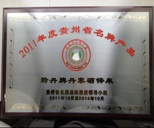 據黔東南州人民政府網 在2011年貴州省名牌產品頒證授牌會上,丹寨縣黔丹硒業有限責任公司的黔丹牌丹寨硒鋅米喜獲2011年度貴州省名牌產品,也是今年黔東南州4個貴州省名牌產品之一。