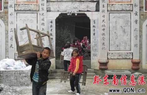 12月6日,錦屏縣隆里小學第二批學生遷離龍標書院,標志著該書院作為教育主陣地成為歷史。建于盛唐時期龍標書院在不同的歷史時期培育了數以千計的人才,堅守千年之后迎旅游大發展,作為“漢文化孤島”現象的標志性建筑群之一得以維修和復建,轉型后將成典型建筑群供世人參觀、學習和瞻仰。圖為學生正抬課桌遷離。(王名端)