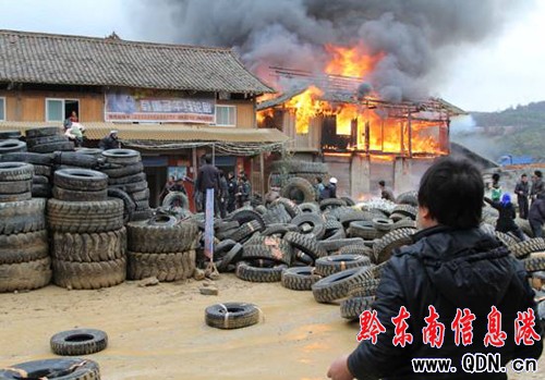 1月14日中午,從江縣洛香鎮老寨村一木樓發生了火災,火勢迅速蔓延,威脅到了存放于此的大量輪胎和著火點對面一家氧氣、乙炔供應站的安全。
