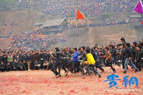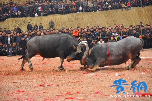 貴網訊 斗牛是苗侗民族喜聞樂見的一項民間傳統活動。2月20日,從江縣丙妹鎮“孔明斗牛堂”舉辦了該縣有史以來規模最大的一次斗牛活動,一共有30頭牛參加了比賽,附近上萬名村民趕來觀看斗牛比賽,場面非常刺激和壯觀。