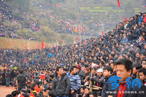 中午12點,天空飄著毛毛細雨,但并沒影響到村民的熱情,上萬村民涌進斗牛塘觀看比賽,一些膽子小的村民只好站在遠處觀看。