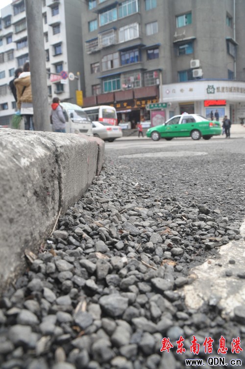不過,比起北京西路,寧波路上的“沙化”現象僅算“小巫”而已。記者在北京西路黔東南州防疫站門口路段看到,大量沙石翻到了路面上,好像是人為鋪設的,斑馬線上的條碼因被沙石覆蓋而變得模糊不清,個別條碼幾乎消失。另外,此處是十字路口,交通繁華,來往車輛較多,車輪壓在沙石上發出的“嘩嘩”的響聲不絕于耳。