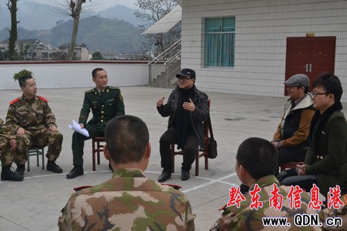圖為鄭建安老師帶領他的學生吳勝利、楊俊一行到臺江縣中隊為武警戰士們進行義務教授歌曲現場