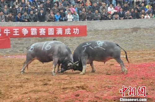 中新網訊 4月14日,中國貴州福泉金谷春雪梨花節猛牛爭霸賽在貴州省黔南州福泉市“金谷春雪”斗牛城舉行。比賽共有來自云南、浙江、廣西、黔東南等地的近80頭斗牛參賽,來自全國各地約2萬名游客到場觀看比賽。