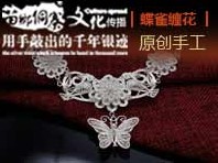 銀飾展示——蝶雀纏花。蝴蝶和鳥都是苗族崇拜的的圖騰,這些生靈與人的思想相互關系,純樸自然的意識,印證的也不過是返璞歸真,讓我們的心性和生命回到最純真的狀態,感觸最初的美麗。