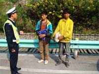 今年9月初,貴州織金縣兩少年在學(xué)校受了委屈,離校出走,沿著高速公路步行趕往福建去投奔在那里打工的親友,14天后抵達(dá)劍河,被高速交警發(fā)現(xiàn)并攔截(見下圖)。據(jù)了解,兩少年路途被搶,身無分文,只好摘吃野果或到莊稼地里尋找食物充饑。交警帶著他們到劍河縣飽餐了一頓。飯后,交警與兩少年的親人取得了聯(lián)系,次日,兩少年在親人的帶領(lǐng)下,踏上了開往貴陽方向的客車。(羅茜)