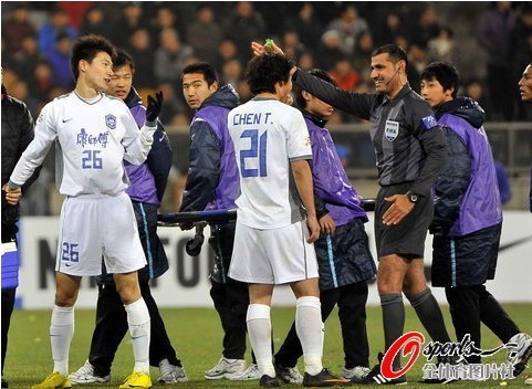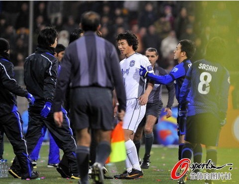 大阪鋼巴一次對盧西亞諾的背后犯規,引發了雙方球員的爭執。好在李瑋鋒等人迅速化解了雙方的緊張氣氛。不過,攝影記者還是捕捉到了陳濤與對方教練的沖突畫面。下半場,陳濤被遠藤保仁從背后放倒,直接被抬出場外治療,后被隊友替換下場。