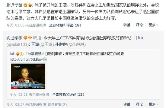這一夜,對關(guān)注中國短道速滑的人來說,顯然是不眠之夜。繼4日晚上王濛和劉顯偉被開除之后,隨之而來發(fā)生的事情就像多米諾效應(yīng)。央視體育頻道專項記者尉遲學(xué)敏在騰訊微博證實了六名短道速滑名將退隊的事實:“除了被開除的王濛、劉顯偉和在會上主動退出國家隊的周洋之外,會議結(jié)束后梁文豪、韓佳良也宣布退出國家隊,另外一位主力隊員劉秋宏也表達了退出國家隊的意愿。這六人幾乎是目前中國短道速滑隊的全部主力陣容。”