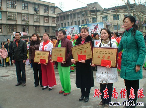 在比賽現場,鑼鼓齊鳴,彩旗飄舞,流光溢彩。來自該縣八個參賽單位的選手隨著秧歌舞曲翩翩起舞,整場比賽,精彩不斷,高潮迭起,熱烈而歡快,突出了健身強體、發展體育的活動主題,展示了新時代新女性的巾幗風采。該縣部分離退休女同志也來到現場打起了腰鼓,扭起了秧歌,為選手們助威,為比賽增色不少。大賽經過的激烈角逐,評選出了一、二、三等獎。并對榮獲一、二、三等獎的代表隊進行了頒獎。
