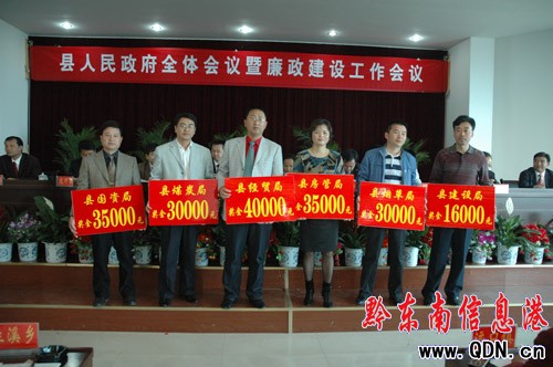 本港訊 (特約記者 姚學(xué)茂 攝影報道)在2010年4月29日召開的天柱縣人民政府全體會議暨廉政建設(shè)工作會議上,為鼓勵先進,鞭策后進,天柱縣斥資51萬元對2009年對完成了財政收入任務(wù)的鄉(xiāng)鎮(zhèn)和縣直部門及2009年受到縣團級以上表彰的單位進行獎勵。獲獎最高的單位達4萬元。