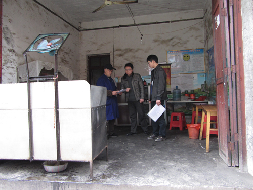 圖為:天柱縣環保局執法人員正在對一餐館現場下達限期整改通知書并耐心做好業主宣傳教育工作者工作。(李桂珍)