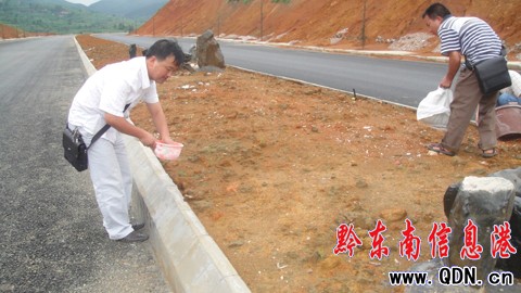 在施工現場,凱里市城管局的工作人員正在在給綠化帶撒草,他們介紹說,撒上去兩個星期就能長出草來,據了解,這段路是凱里市仰阿莎廣場至三棵樹的主干線,目前路燈招標基礎已經完成, 8月2日舉行通車典禮。