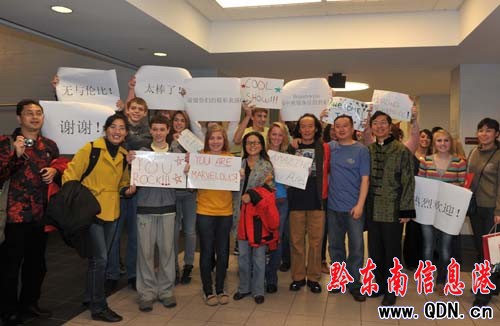演出結(jié)束,該校學(xué)生用中文打出太棒了、無以倫比、非常精彩等表示感謝--王京廣攝