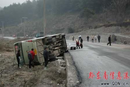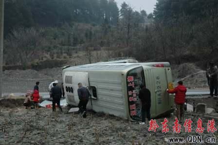1月14日上午8時許,位于凱里市龍場鎮的省道凱(里)施(秉)線6公里加400米處,由于路面結冰,一輛由凱里發往黃平的大客車失控側翻,造成車內8名乘客受傷,其中兩人傷勢較重。圖為長途大客車側翻事故現場。 (特約記者 陳沛亮 攝)