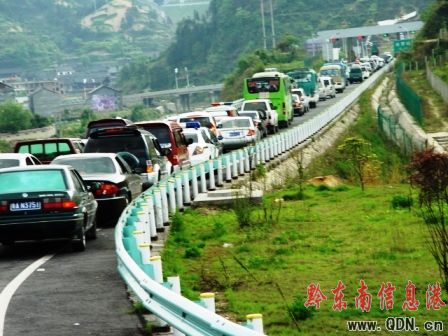 據當地旅游部門不完全統計,本屆姊妹節開幕式當日進入和途經臺江的各種大小車輛達5686輛,游客人數高達65488人次,創歷年姊妹節活動人數最高紀錄。臺江高速征費站免費暢行,為姊妹節順利開幕提供了保障,也給外來游客留下了良好的形象。(圖為姊妹節開幕式當日臺江高速征費站前擁堵的車輛)