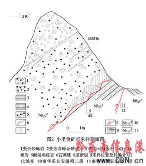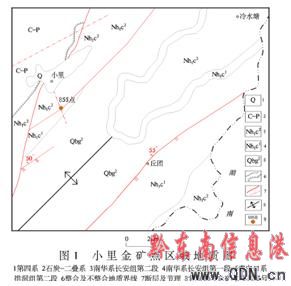 2007年8月,筆者在黔東南地區(qū)開展金礦路線調(diào)查時,新發(fā)現(xiàn)小里蝕變巖型金礦,礦體產(chǎn)于南華系長安組第二段底部的層間構(gòu)造蝕變帶內(nèi),底部滑脫面清楚,蝕變帶由構(gòu)造巖塊、構(gòu)造角礫巖、碎裂巖、石英脈等組成。碎裂巖具明顯的硅化和裉色化。