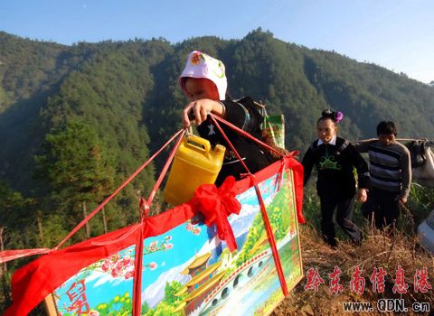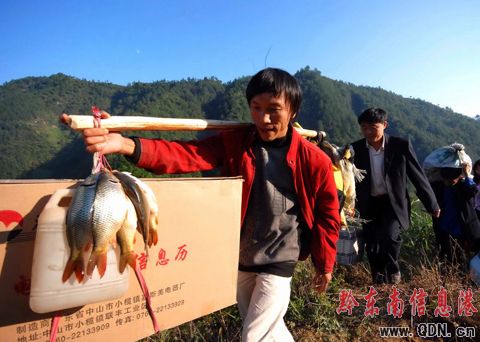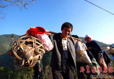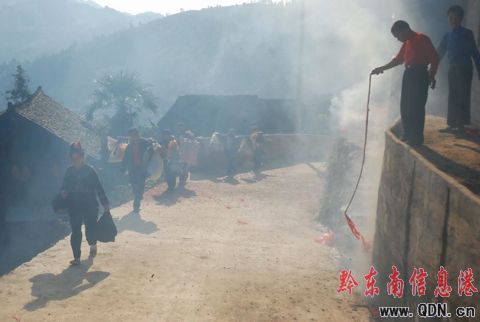 本港訊 (陳沛亮 攝影報(bào)道)11月8至19日,凱里市三棵樹鎮(zhèn)大烏燒村苗族同胞舉行13年一次的“牯藏節(jié)”,當(dāng)?shù)丶壹矣H友、客人匯聚,舉行11天的隆重祭祀和蘆笙舞等活動(dòng)。圖為11月8日,苗族同胞挑著禮物到凱里市三棵樹鎮(zhèn)大烏燒村參加“牯藏節(jié)”和燃放火炮、宰雞殺鴨招待參加“牯藏節(jié)”的客人。