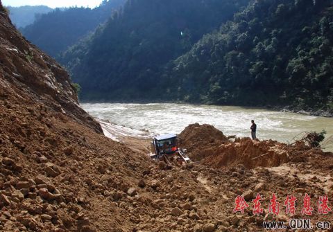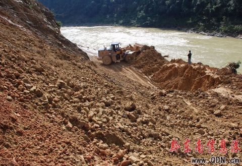 本港訊 (高建層 陳沛亮 攝影報道)榕江縣持續(xù)暴雨,境內(nèi)321國道K998公里+100米處邊坡坍塌發(fā)生8000余立方山體滑坡,泥石覆蓋阻塞了100多米長的公路路面,交通中斷,所幸無人員傷亡。 榕江公路管理段迅速啟動緊急預(yù)案組織搶修人員和機械進場搶修。截止記者發(fā)稿為止,搶修工作仍緊張進行當(dāng)中。公路搶修部門預(yù)計11月10日才能恢復(fù)通車。圖為 2008年11月8日,公路搶險人員在321國道榕江段山體滑坡現(xiàn)場清除泥石。