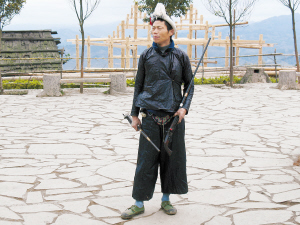 位于貴州省東南邊境的岜沙是一個奇特的苗族村寨。在離從江縣城7.5公里的月亮山上,我們走進了岜沙。村口標志點就在岜沙小學對面,一棵碩大的古樹邊立著一塊木碑,上面刻著剛勁秀氣的兩個大字——岜沙。環顧四周,一個古遠的原始部落景象映入你的眼簾——村民們不管男女都穿著土法染制的民族服裝,以豬肝紅、藏藍色為主,亮亮的,像金屬片一樣地反著光。男人們梳著小辮,頭綰發髻,腰間別著砍刀,手里捏著牛角,肩頭挎著獵槍。據說,岜沙的男孩在7歲到15歲之間,必須舉行一次剃洗禮,由族長用煮蛋水把鐮刀磨利給男孩剃頭,僅留著頭頂部的頭發綰髻,并終身保持這個發式,一旦發髻周圍的頭發長了,就要請族長把長出來的短發剃掉。2月28日下午,成人剃發的一幕剛好被我們看到。