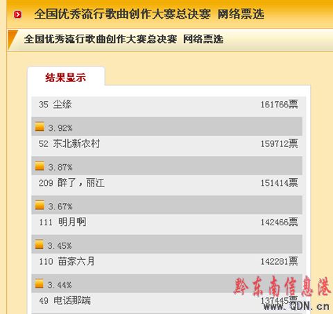 為了支持我州本土原創(chuàng)歌曲,增強我州歌曲作者的創(chuàng)作熱情,并借此宣傳黔東南的民族文化。在黔東南州州委宣傳部的倡議以及黔東南各大媒體的支持下,全州民眾以極大的熱情紛紛對《苗家六月》進行投票。截止今日(2009年3月30日 11點整)《苗家六月》已獲得142281票數(shù),暫列第五位。