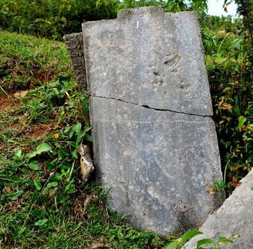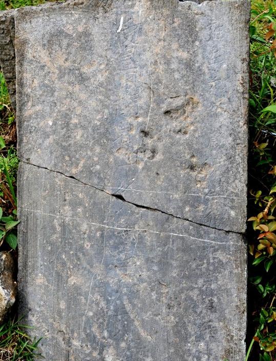 該墓座北朝南,現(xiàn)場(chǎng)只有碑體的三部分:碑帽、碑面和一條夾桿。由于時(shí)間久遠(yuǎn),碑面歪斜,中部斷裂,風(fēng)化嚴(yán)重,大部分字跡模糊,碑帽后翻于墳頭,夾桿離位倒向一側(cè)。墓碑周圍長(zhǎng)滿了荒草荊棘,顯然是一棺被人遺忘久遠(yuǎn)的墓冢。